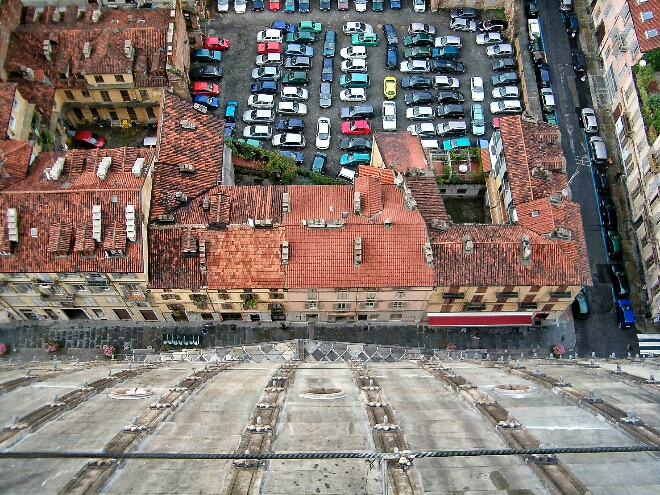 Poi qualcuno ha chiamato i pompieri. Sono giunti a sirene spiegate e hanno sistemato il tappeto proprio sotto di lui. Lui ogni tanto urla mi butto tra…, e dice una cifra in minuti. Tipo 164, o 73, o 29. Poi si muove un poco di lato, e si risistema nella stessa identica posizione in cui è adesso. Venticinque metri sotto il tappeto lo segue come un cane che aspetta un boccone.