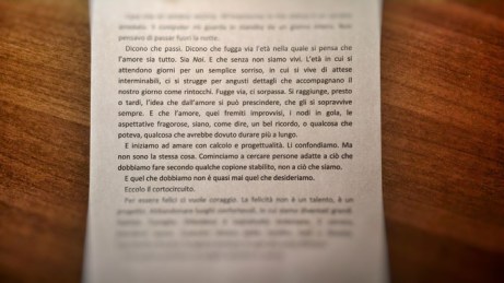 L’inizio dei romanzi è delicato, un momento intimo e talmente esatto che non lascia scampo. Come il primo sguardo che rivolgi a uno sconosciuto. Come un alfabeto segreto che garantisce comunicazione indisturbata. L’inizio dei romanzi esige esclusività. Per questo, adesso, che ho iniziato a scrivere qualcosa a cui tengo molto, ho deciso di dirmelo. Di urlarmelo. Ho scelto questa storia invece di tante altre, e vado così.