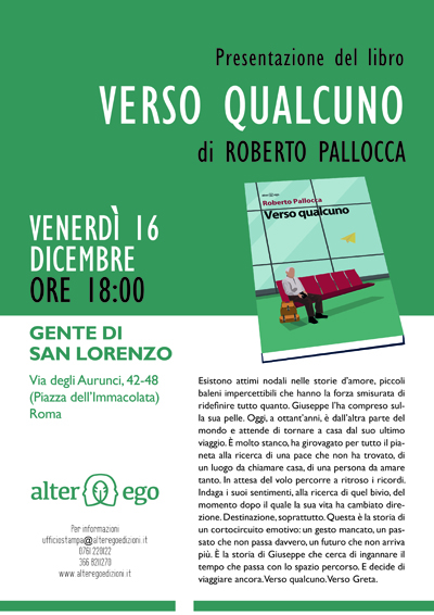 Il prossimo venerdì, 16 dicembre 2016, alle ore 18, ci sarà la prima presentazione del mio nuovo romanzo “Verso qualcuno“, pubblicato da Alter Ego edizioni e ancora caldo di stampa dopo l’anteprima a Più libri più liberi, la Fiera della Piccola e media editoria di Roma.