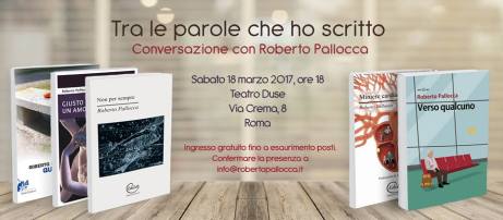 Domani, sabato 18 marzo 2017, alle ore 18, al Teatro Duse di Roma – via Crema, 8 – si terrà un evento, che non sarà una presentazione, che non sarà un reading, che non sarà un firmacopie o un incontro con l’autore, ma una festa, un’occasione per riunirmi coi lettori – e gli amici – che in questi anni mi hanno manifestato vicinanza e stima, e farlo intorno ai cinque libri che ho pubblicato e che mi hanno regalato tante soddisfazioni e tanto affetto.